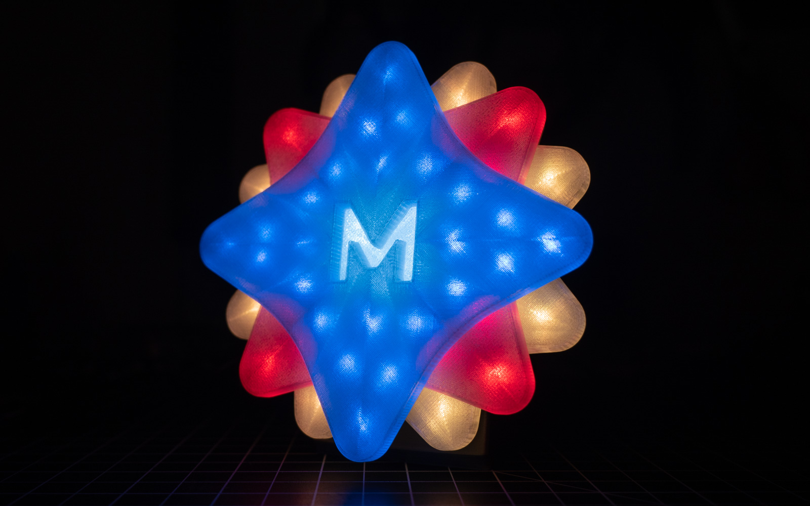 The MetaLab logo is a compass rose with 16 points, and an "M" in the center. I decided the new project would be a desk ornament of the logo, where the color of each point was controllable via Bluetooth and a mobile app.