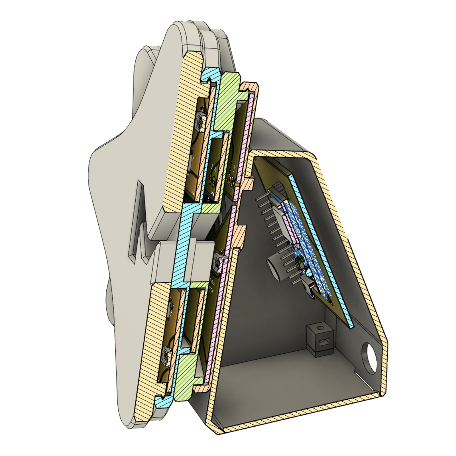 A cross-section of the completed PCBs and 3D model, showing how the segments of the logo clip into each other, and hold the PCBs in place.