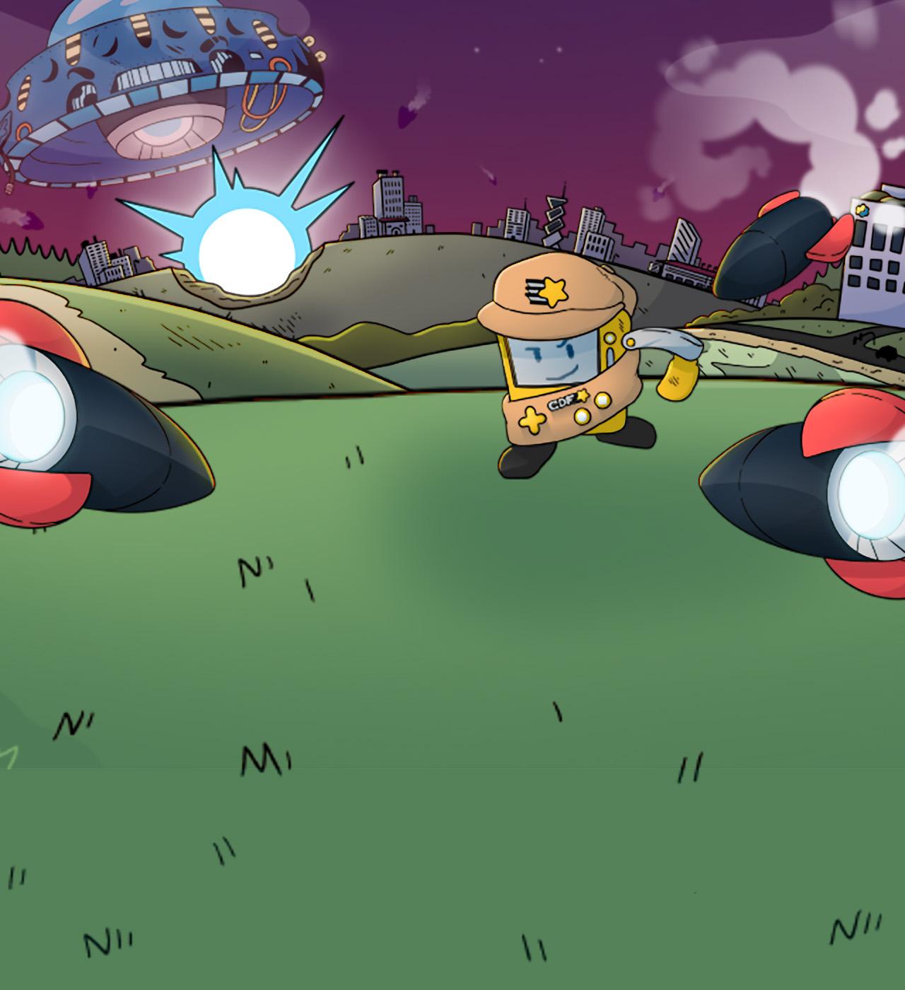 An alien invasion threatens to destroy all life on Playtopia! Crank Defense Force remote missile pilots are the planet's last hope.
