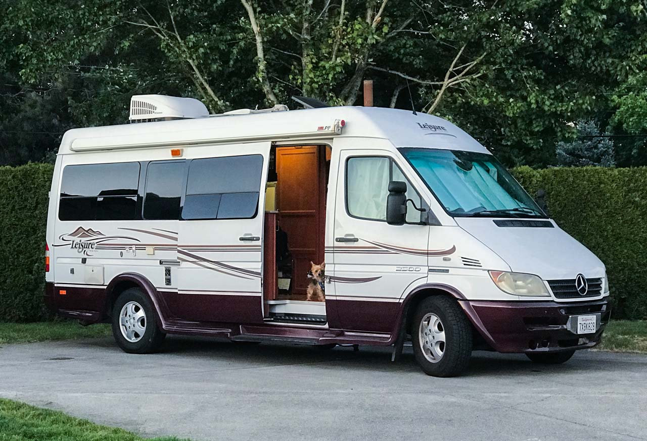 After lots of online research and visiting an RV show for some hands-on, we were firmly settled on getting something based on the Mercedes Sprinter chassis (aka a FedEx van). We found a good deal on a used 2006 Sprinter conversion (Leisure Travel FS210B) that had been a rental for the last decade, bought it, and immediately headed up to Portland with our two dogs in tow.